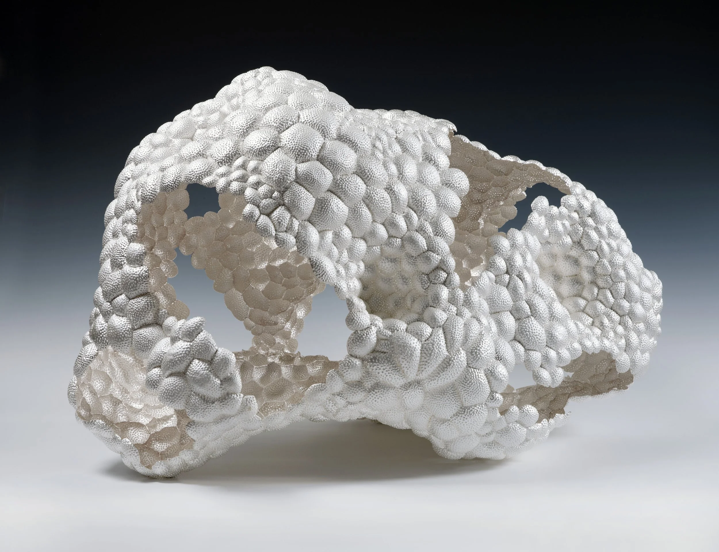 The assembling of forged and cast metal is the key to her work, whether mild steel or pure silver. Her observations of tree and plant matter are the driving force behind many of her sculptures which vary in scale from small objects in precious metal through to fairly massive welded steel works of art.